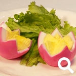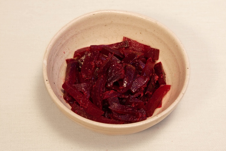 ビーツのスイートピクルスの液を利用する場合は、酢、水、塩を足して一度煮立て、茹で卵を入れる。