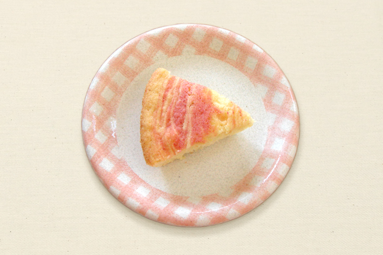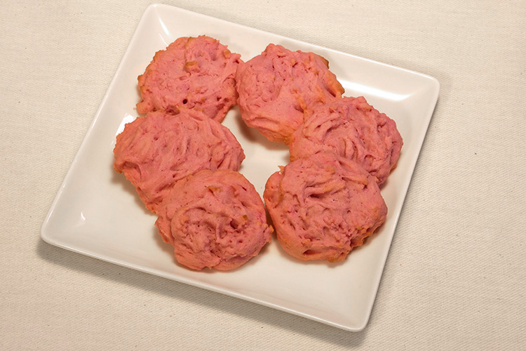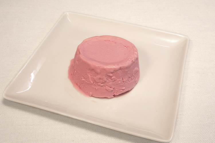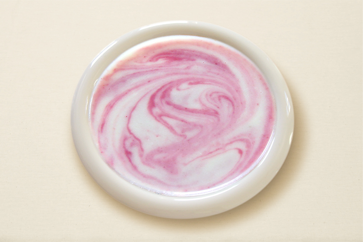 ④ ③の一部にピューレを加え、ピンクにしてから白い方に入れ、箸などでかきまわしてマーブル模様にする。
